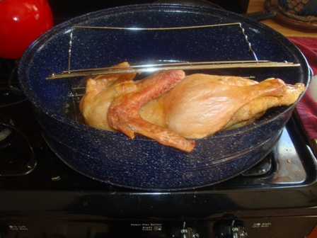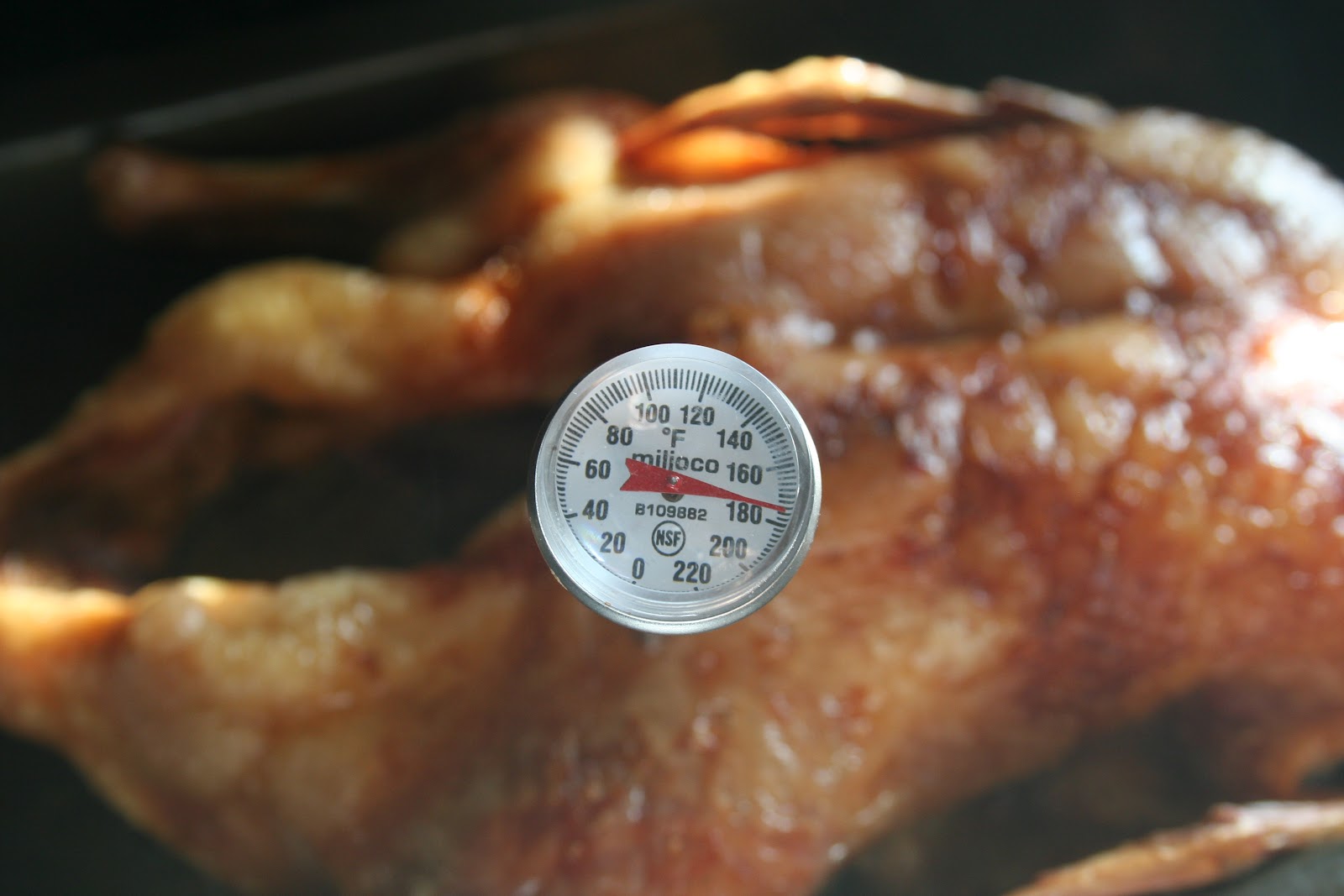 I cooked it exactly 2 1/2 hours and it reached 180 degrees!! Be warned, the smell of roasting duck will fill your house and make your stomach growl! And don’t feel guilty when you begin to remove the cooked skin from the duck and you taste a little piece. Yummy!