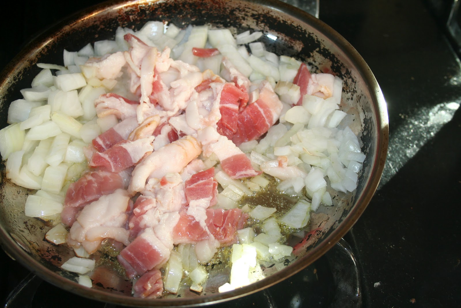 1. Heat oil over medium heat in saucepan. Add onions and bacon and cook for 5 minutes.