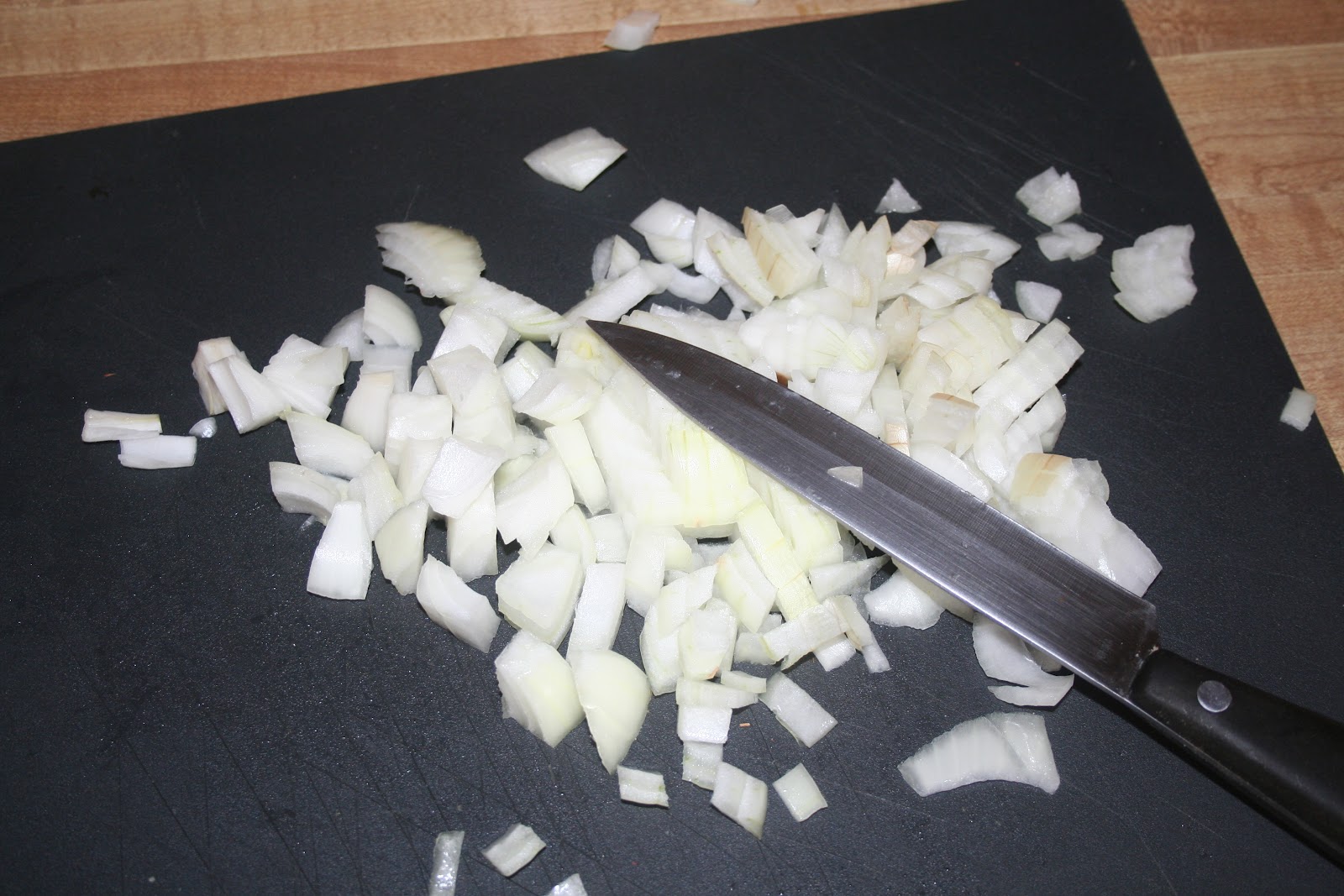 Add the onion to the pan along with 6 chopped up slices of bacon. I use Indiana Kitchen bacon, a company located in Delphi, Indiana! This is one of the packing facilities my family sells our hogs to, so I always think some of this bacon may have been walking around my farm a few weeks earlier.